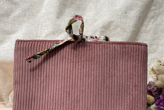 Fermeture grâce à des liens en coton assortis à la pochette